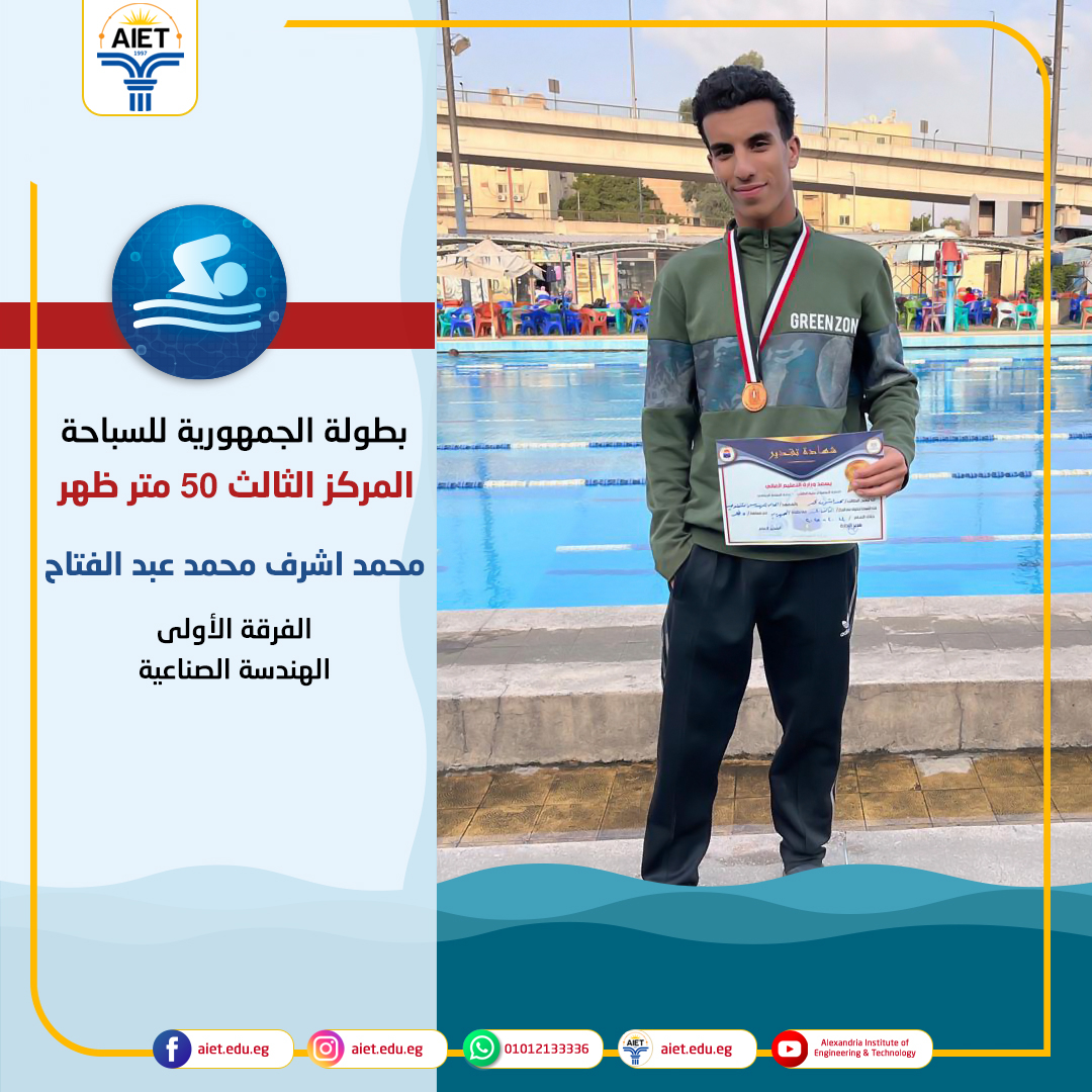 يهنىء معهد الإسكندرية العالي للهندسة والتكنولوجيا طلابه الأعزاء الفائزين في بطولة الجمهورية للسباحة التي أقيمت يوم الخميس الموافق 7/11/2024 حيث حصل الطالب / محمد عاطف محمد فكري بالفرقة الرابعة قسم هندسة الإلكترونيات والإتصالات على المركز الثاني🥈50 متر صدر كما حصل الطالب / محمد أشرف محمد عبد الفتاح بالفرقة الأولى قسم الهندسة الصناعية على المركز الثالث🥉50 متر ظهر. ألف مبروك💐