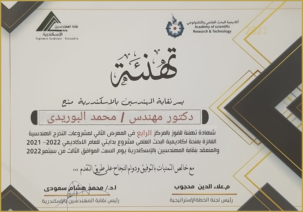 شارك معهد الإسكندرية العالي للهندسة والتكنولوجيا بعدد 6 مشروعات في المعرض الثاني "بدايتى" الذي نظمته نقابة المهندسين بالإسكندرية بالتعاون مع أكاديمية البحث العلمي للعام الأكاديمي (2022/2021)، بمشاركة إجمالي 15مشروع لطلاب الهندسة فى السنة النهائية بمحافظة الإسكندرية.