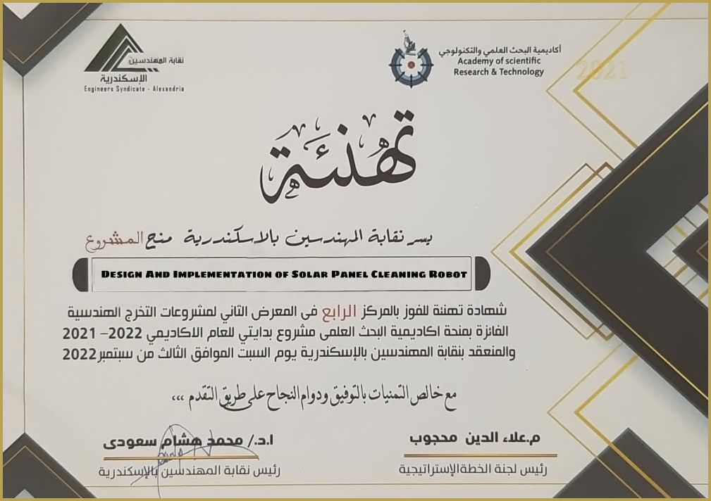 "Design and Implementation of A Smart Robot for Solar Panel Cleaning"
