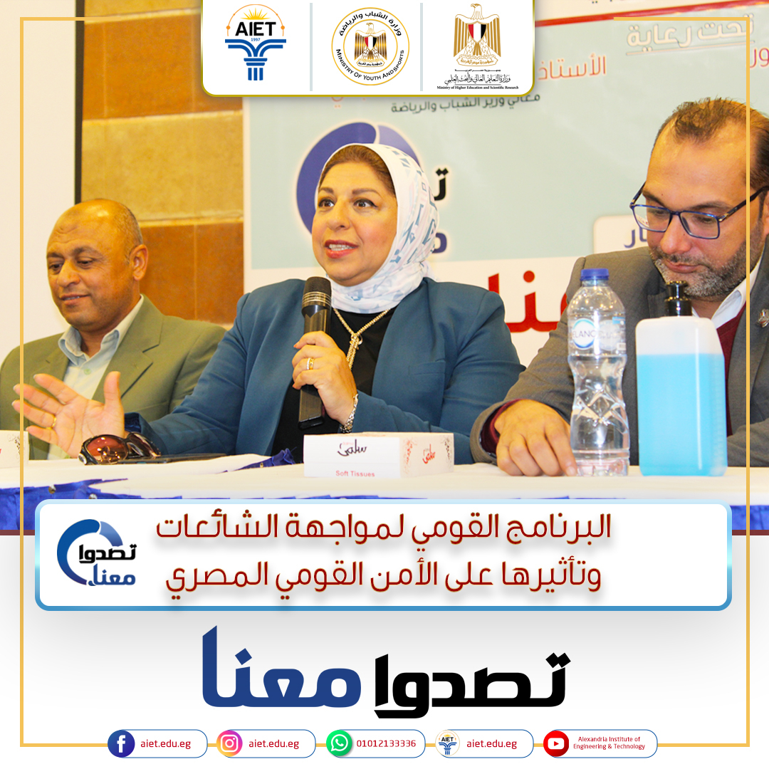 قام معهد الإسكندرية العالي للهندسة والتكنولوچيا بتنظيم ورشة لتدريب عدد من طلاب المعهد تحت شعار ( تصدوا معنا ) لمواجهة الشائعات وذلك تحت رعاية الاستاذ الدكتور / محمد ايمن عاشور وزير التعليم العالى والبحث العلمى والاستاذ الدكتور / أشرف صبحى وزير الشباب والرياضة وبالتعاون مع إدارة النشاط الإجتماعى بوزارة التعليم وذلك من ضمن فاعليات المبادرة القومية (تصدوا معنا ) لمواجهة الشائعات وسرعة الرد عليها والبرنامج القومى لمواجهة الشائعات الذى تنظمة وزارة الشباب والرياضة فى المحافظات وذلك على مدار يومى السبت الموافق 22/10/2022 والاحد 23/10/2022 وذلك بحضور كلاً من الاستاذ الدكتور / محمد الغريب صقر عميد المعهد والاستاذ الدكتور / وجيه العسكرى وكيل المعهد والمهندس محمد دراز أمين عام المعهد ومجموعة من وزارة الشباب والرياضة ووزارة التعليم العالى وهم: أ/ محمد غريب حسن : إدارة النشاط الإجتماعى بالإداره العامه لرعاية الطلاب بوزارة التعليم العالى أ/ سلافه سليمان بدر : مدير إعداد القاده بمديريه الشباب والرياضه بالإسكندريه د/ ياسر فؤاد : مسئول برلمان الشباب والطلائع ومحاكاة مجلس الشيوخ بالإسكندريه أ/ أحمد نجم : مستشار الوزاره للتدريب د/ مى الوردانى : مدرب بالبرنامج القومى لمواجهة الشائعات ا.محمد لطفى ادارة النشاط الاجتماعى بوزارة التعليم العالى حيث اثنى جميع السادة الضيوف على التنظيم والمشاركة الفعاله للمعهد حيث انه يعتبر أول معهد يقوم بتنظيم المبادرة على مستوى المعاهد كما اثنى الطلاب الحاضرين على محتوى الورشة