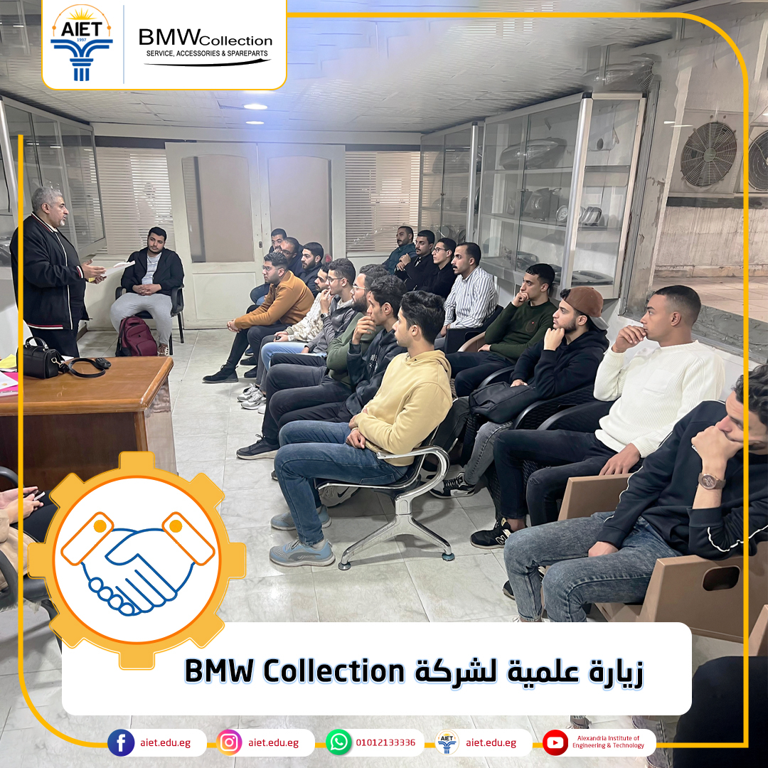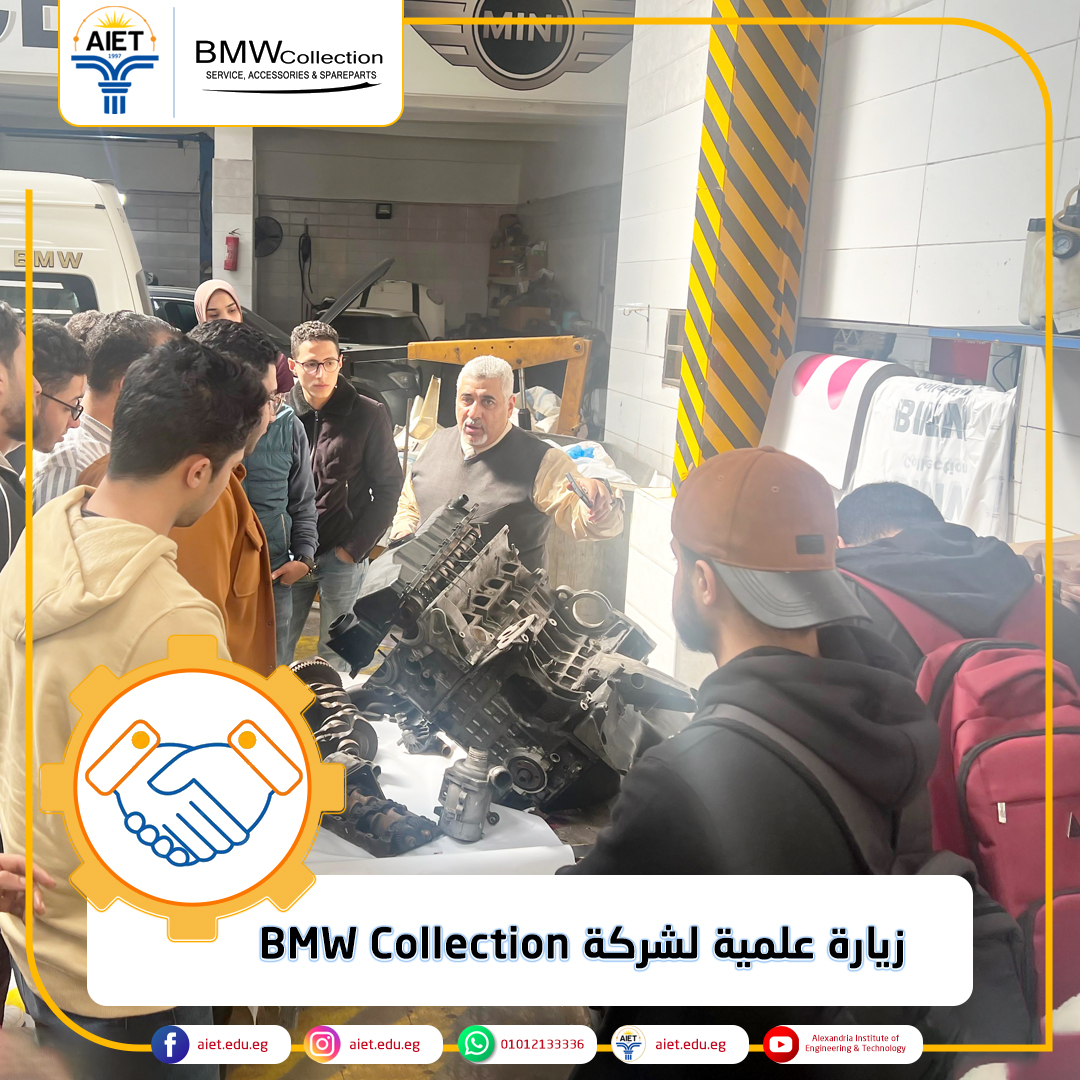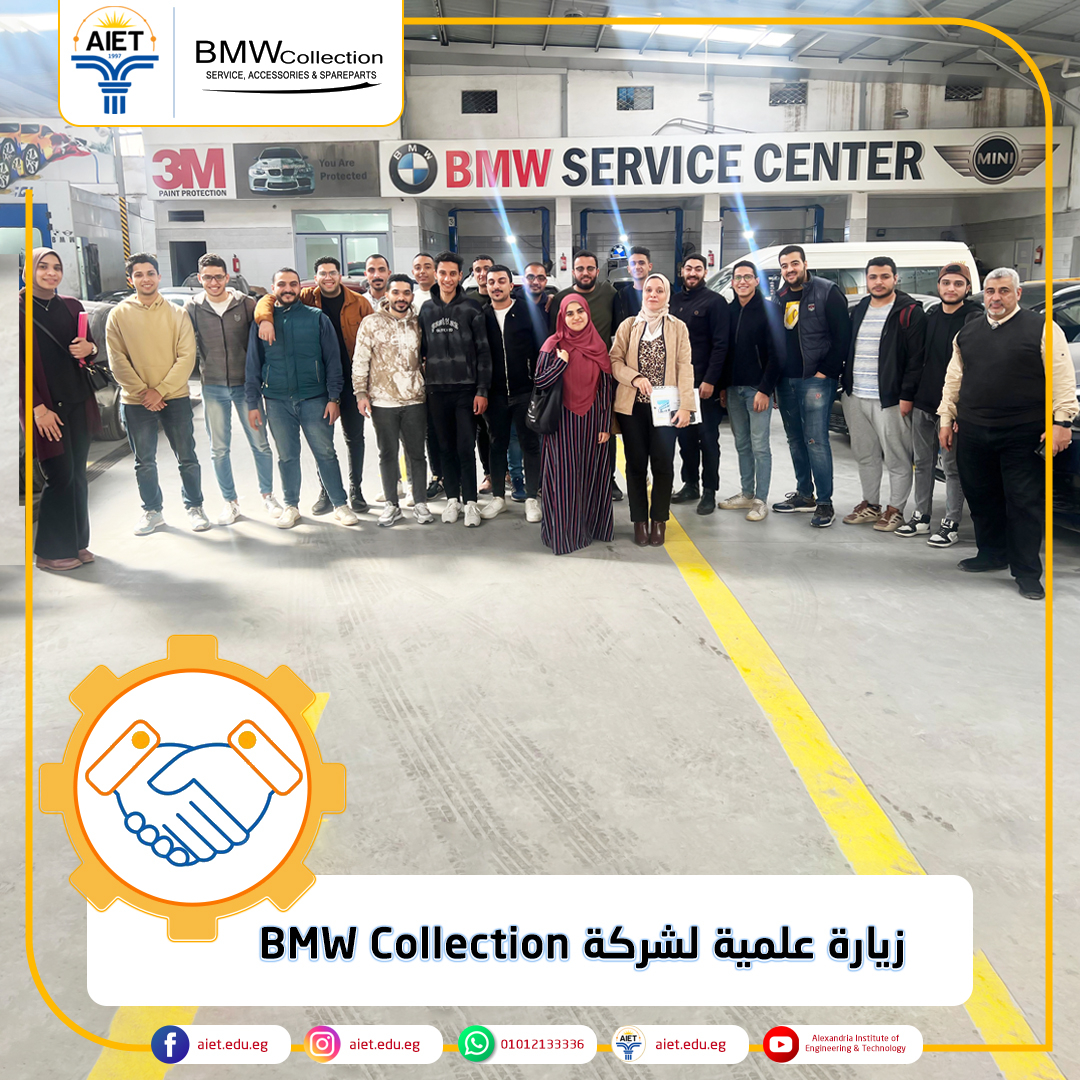 في إطار أنشطة وحدة التدريب بمعهد الإسكندرية العالي للهندسة والتكنولوجيا تم تنفيذ زيارة علمية لطلاب الفرقتين الثالثة والرابعة قسم الهندسة الصناعية لشركة BMW Collection أحد شركاء المعهد من الصناعة. تمت الزيارة تحت إشراف أكاديمي الدكتورة/ هبة الحداد المدرس بقسم الهندسة الصناعية والمهندسة/ ندى إيهاب عضو هيئة معاونة بقسم الهندسة الصناعية حيث يسعى المعهد لربط الدراسة الأكاديمية بالتطبيقات العملية لإعداد خريجين قادرين على المنافسة في أسواق العمل المحلية والدولية.