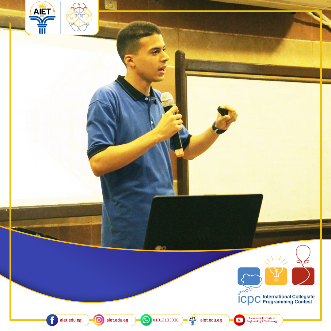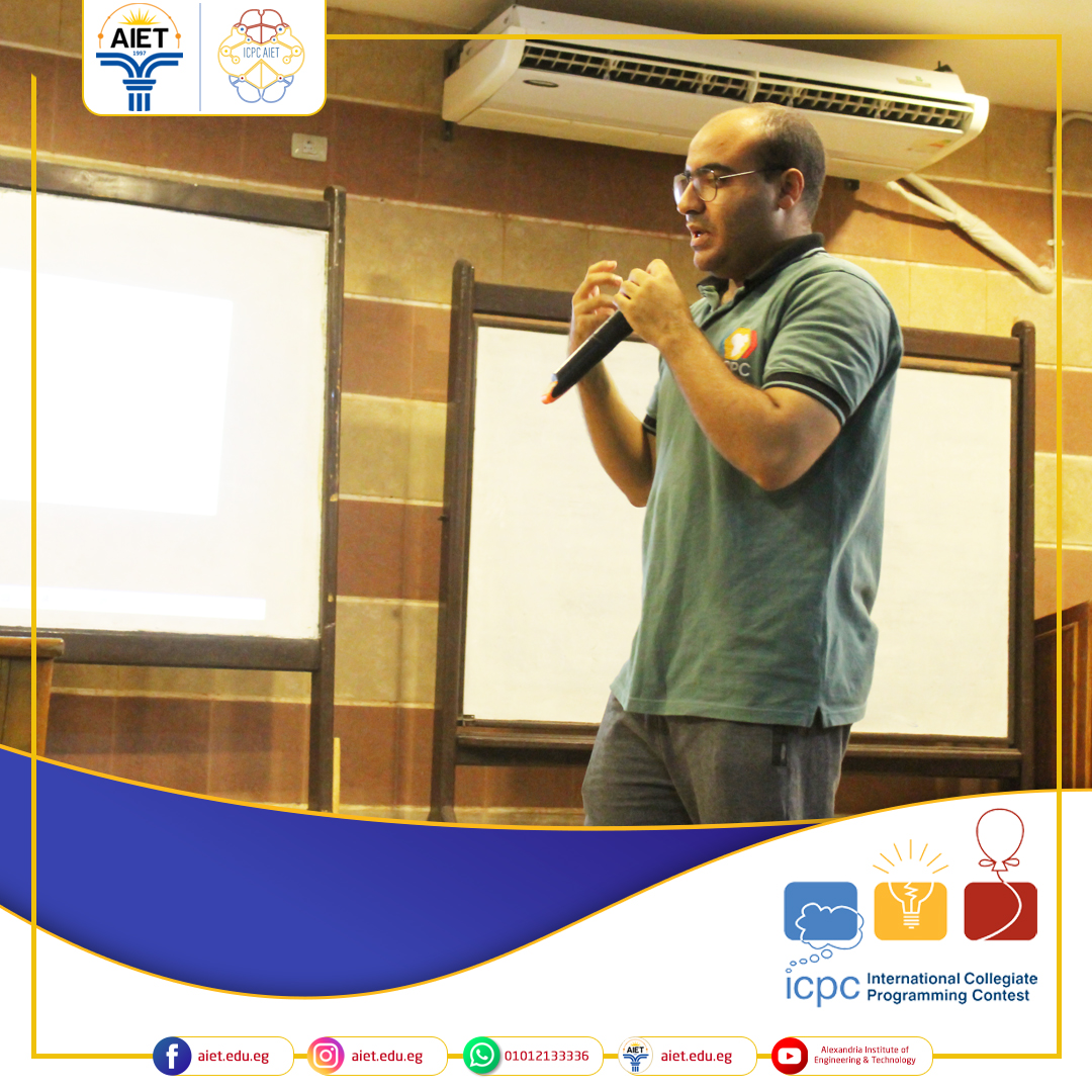 في إطار حرص معهد الإسكندرية العالي للهندسة والتكنولوجيا على الإهتمام بالأنشطة الطلابية وتشجيع روح الإبتكار في مجال البرمجيات وربطها بحل المشكلات و بالتعاون مع ICPC AIET بمركز الإبداع العلمي تم عقد محاضرة تعريفية بالنشاط الطلابي ICPC AIET والذي يؤهل طلاب المعهد للإنضمام إلى المسابقة المصرية للبرمجة لشباب الجامعات ECPC وكذلك المسابقة العربية والأفريقية ACPC والمسابقة الدولية للبرمجيات ICPC.