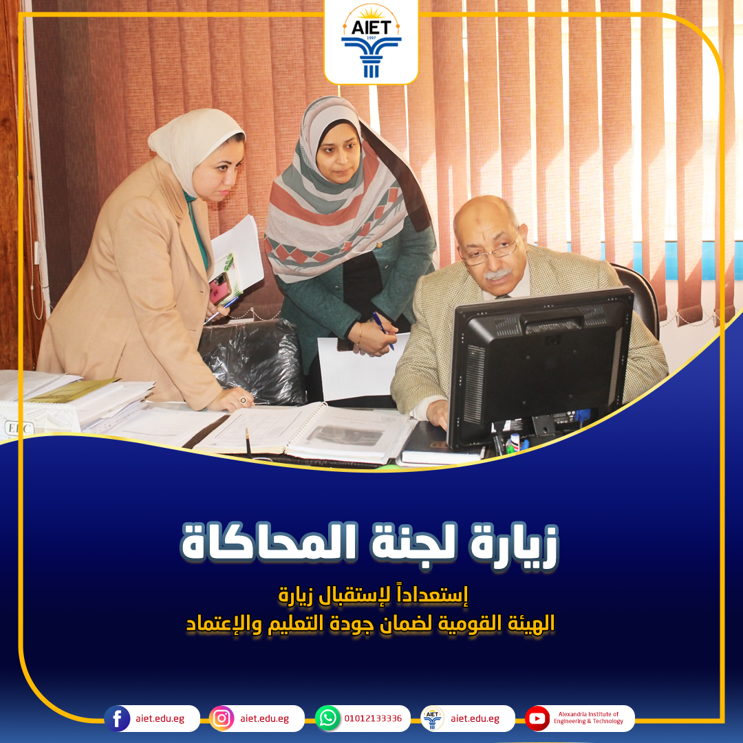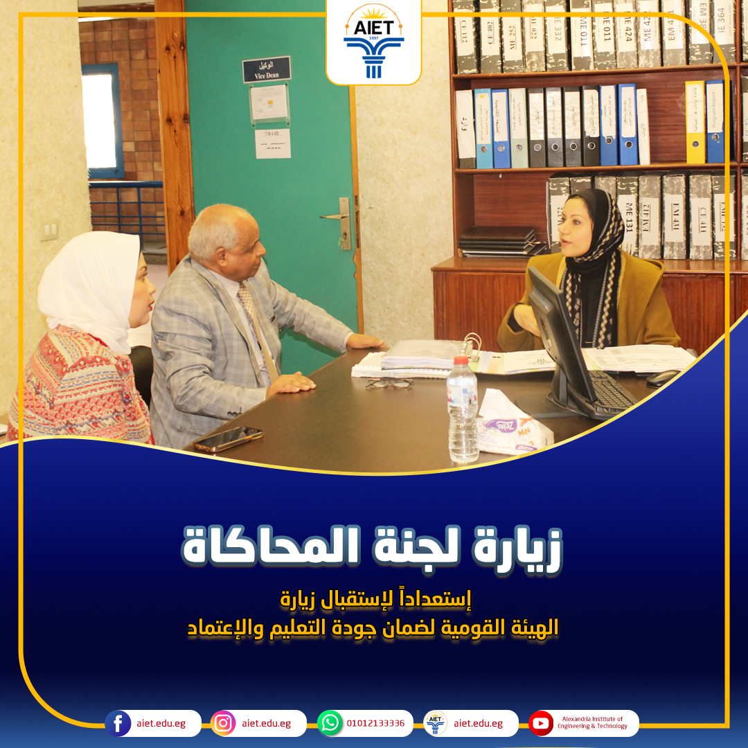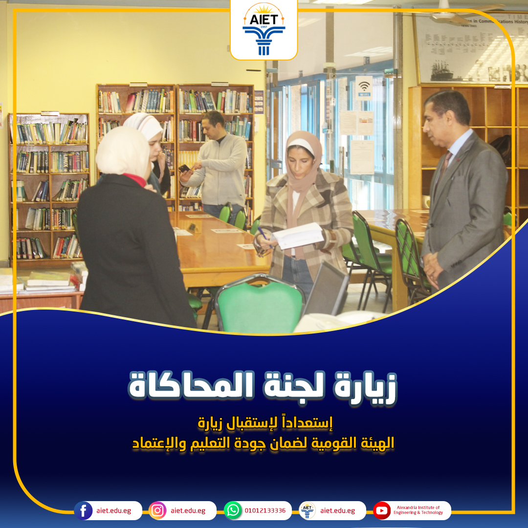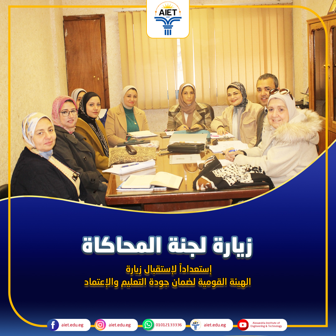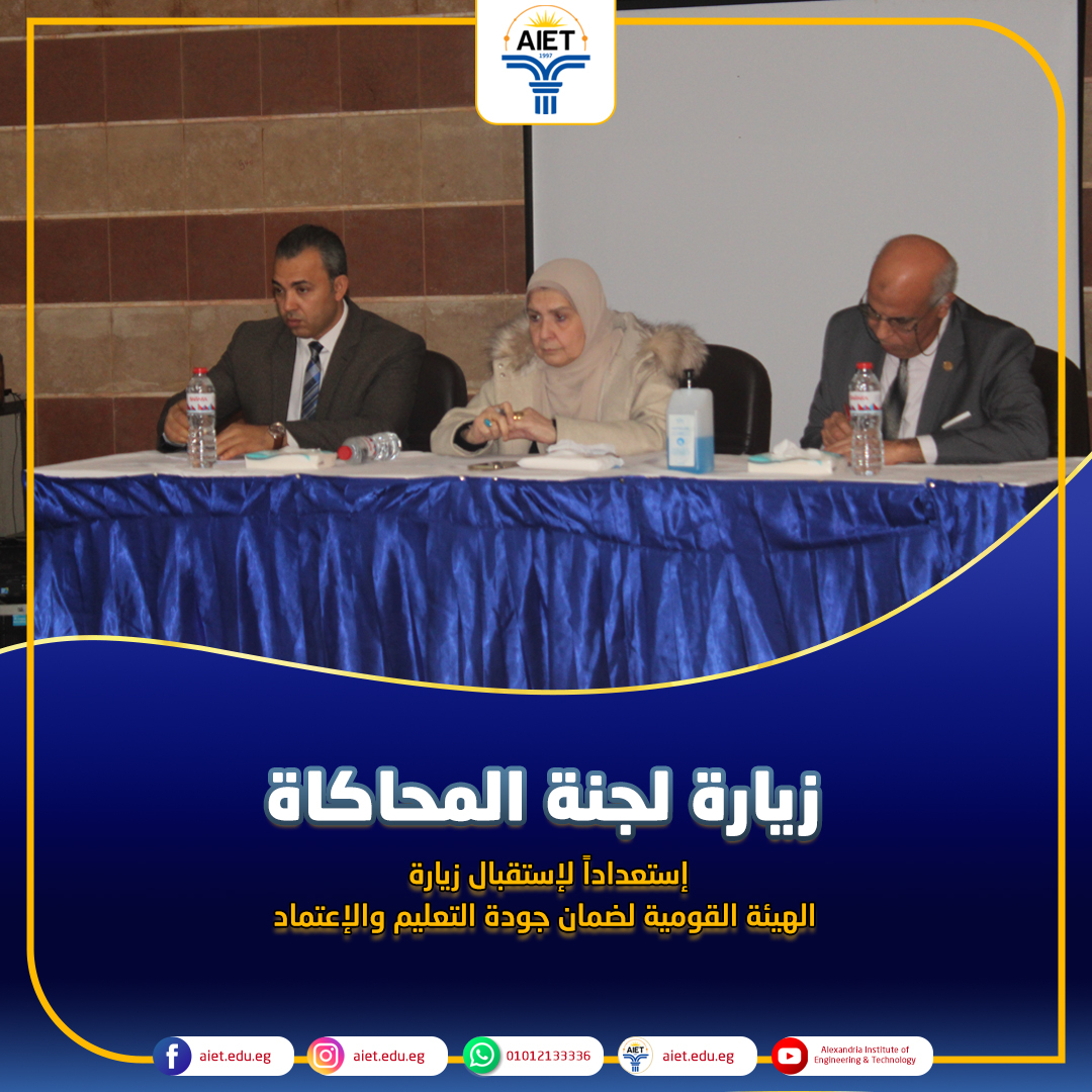 في إطار إستعداد معهد الإسكندرية العالي للهندسة والتكنولوجيا لاستقبال زيارة الإعتماد البرامجي من قبل الهيئة القومية لضمان جودة التعليم والإعتماد وبناء على توجيهات السيد الدكتور/ محمد عبد الفتاح رجب رئيس مجلس الإدارة وتحت إشراف السيد الأستاذ الدكتور/ وجيه العسكري عميد المعهد، قام فريق من مركز ضمان الجودة بجامعة فاروس بالإسكندرية برئاسة الأستاذة الدكتورة/ نورهان فناكي - نائب رئيس الجامعة والمشرف على مركز ضمان الجودة بالجامعة بتنظيم زيارة محاكاة اليوم السبت الموافق 24 فبراير 2024 طبقا لمعايير إعتماد البرامج إصدار يوليو 2022 الصادر من الهيئة القومية لضمان جودة التعليم والإعتماد. تم استهلال الزيارة بعقد لقاء بروتوكولى مع عميد المعهد ومدير وحدة ضمان الجودة والسادة رؤساء الأقسام العلمية و القيادات الأكاديمية والإدارية بالمعهد عقبه مجموعة من اللقاءات وفحص الوثائق، وتستمر الزيارة لمدة ثلاثة أيام بمشيئة الله.