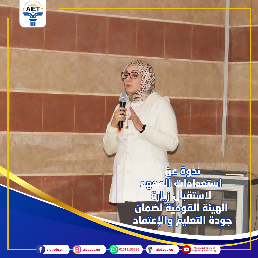 نظم معهد الإسكندرية العالي للهندسة والتكنولوجيا تحت رعاية الإدارة العامة لرعاية الطلاب بوزارة التعليم العالي وبالتعاون مع وزارة الشباب والرياضة ومؤسسة إنجاز مصر المبادرة الرئاسية " عاملة شغل " والتى تهدف لتدريب 1200 فتاة من طالبات الفرقة الرابعة وحديثي التخرج خلال العامينتحت رعاية السيد الأستاذ الدكتور عميد المعهد ووحدة ضمان الجودة بالمعهد تم عقد لقاء مع طلاب الفرقة الإعدادية مع كلاً من أ.م.د / محمد الأمير رئيس قسم هندسة الإلكترونيات والإتصالات وأ.م.د/ يسرا حمدي رئيس قسم العلوم الأساسية بالمعهد لتعريف الطلاب بأقسام المعهد المختلفة وفرص العمل المتاحة لكل قسم وكيفية التفكير المنطقي أثناء إختيار القسم المطلوب الإلتحاق به. ثم قام الدكتور محمد الأمير منسق المعهد لدى الهيئة القومية لضمان جودة التعليم والإعتماد بالتحدث مع الطلاب عن مفهوم الجودة الشاملة ودور الطالب في منظومة الجودة داخل المعهد. جاء ذلك ضمن إستعدادات المعهد لإستقبال زيارة الهيئة القومية لضمان جودة التعليم والإعتماد خلال النصف الثاني من العام الدراسي الحالي.
