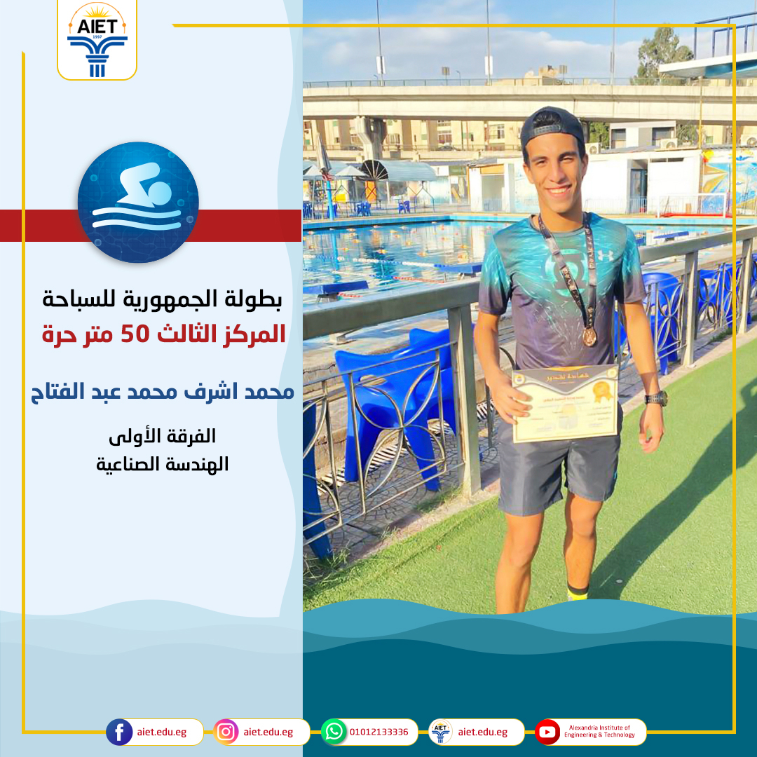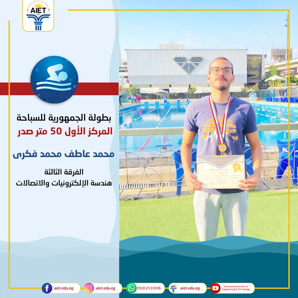 يهنىء معهد الإسكندرية العالي للهندسة والتكنولوجيا طلابه الفائزين في بطولة الجمهورية للسباحة التي أقيمت بنادى السكة الحديد بمدينة نصر بالقاهره، حيث حصل كلا من: الطالب/ محمد عاطف محمد فكرى محمود السيد ماهر بالفرقة الثالثة قسم هندسة الإلكترونيات والإتصالات على المركز الأول في مسابقة 50 متر صدر. الطالب/ محمد اشرف محمد عبد الفتاح محمد رجب المقيد بالفرقة الأولى قسم الهندسة الصناعية على المركز الثالث 50 متر حرة. الطالب/ محمد احمد محمد ابراهيم سالم بالفرقة الإعدادية على المركز الرابع 50 متر زعانف والسابع 50 متر حرة. منتخب المعهد للسباحة على المركز الرابع 50 متر زعانف تتابع والمركز الرابع 100 متر حره تتابع ألف مبروك